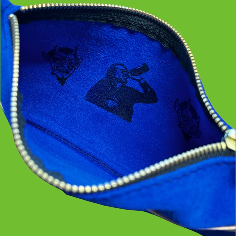 Leather strip Hand stamped blue bird poem intro by C. Bukowski. On royal blue suede
