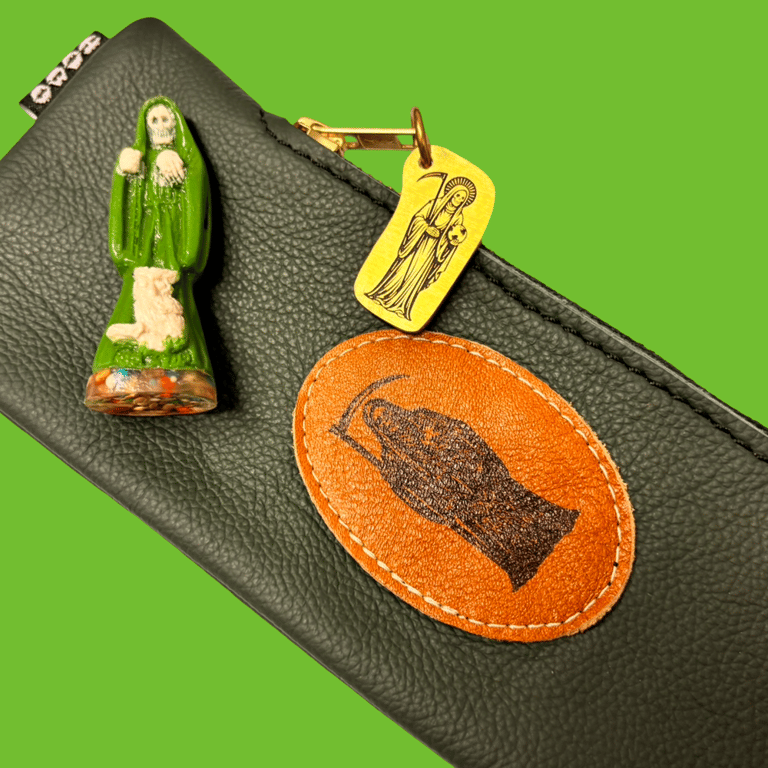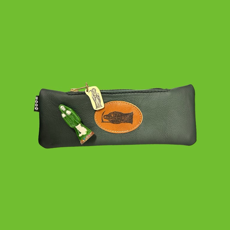 Green leather Standard Size sack, Santa Patch with Custom pull tab with Brass zipper.